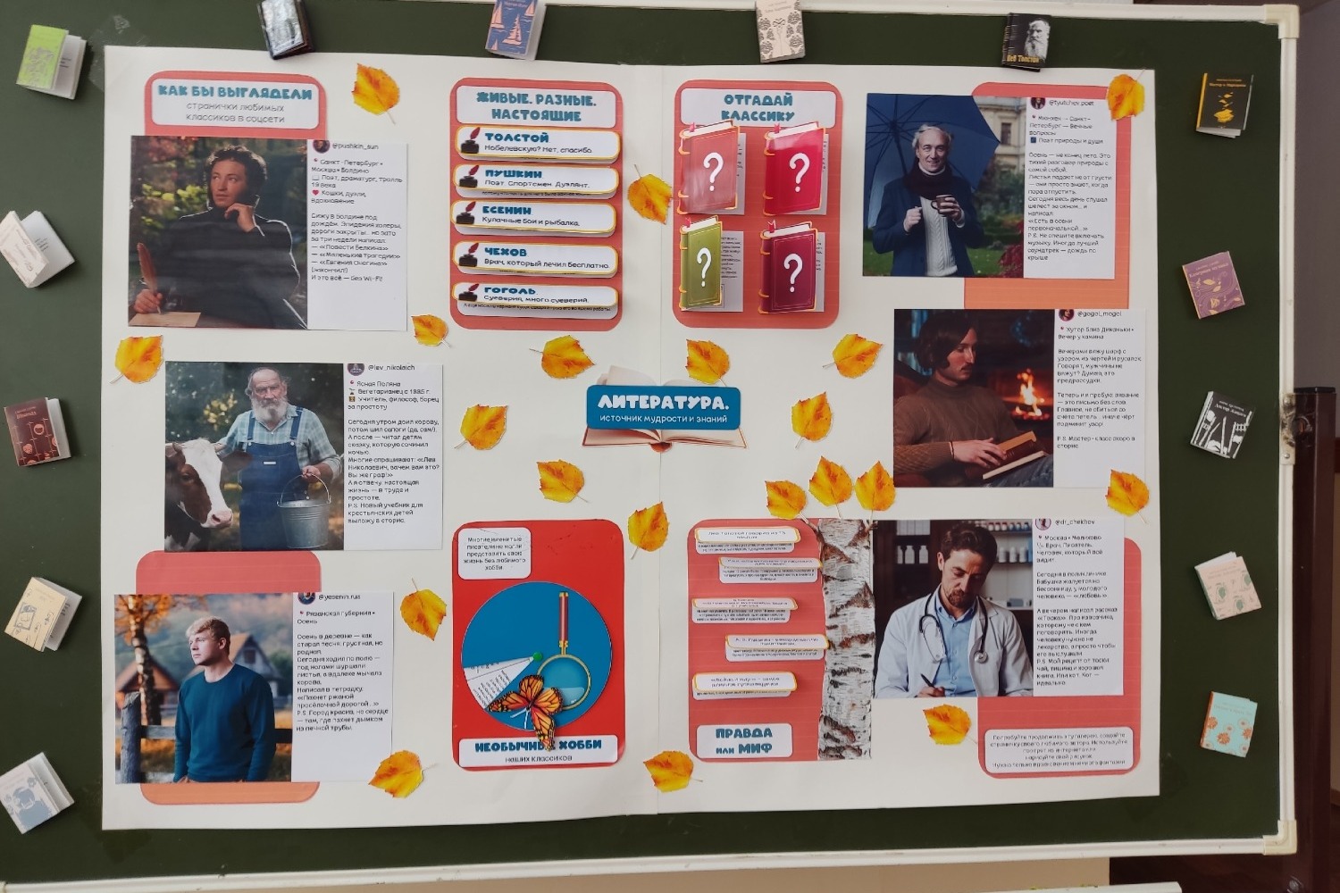 Рядом — тематические газеты о русском языке и литературе. Здесь можно было узнать любопытные факты из биографий писателей, познакомиться с разбором их произведений и попробовать свои силы в викторинах.