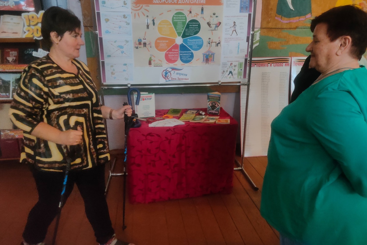 Присутствующие с интересом слушали обзор книжной выставки, участвовали в тренинге, рассказывали о любимых занятиях физкультурой, о пользе скандинавской ходьбы.