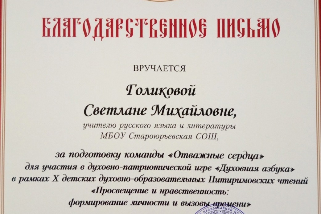 Юные представители округа не только наблюдали за дискуссиями, но и сами добились успехов в рамках детской программы в православной гимназии. В них участвовала команда обучающихся 8 «А» класса Староюрьевской СОШ «Отважные сердца» под руководством Светланы Голиковой.